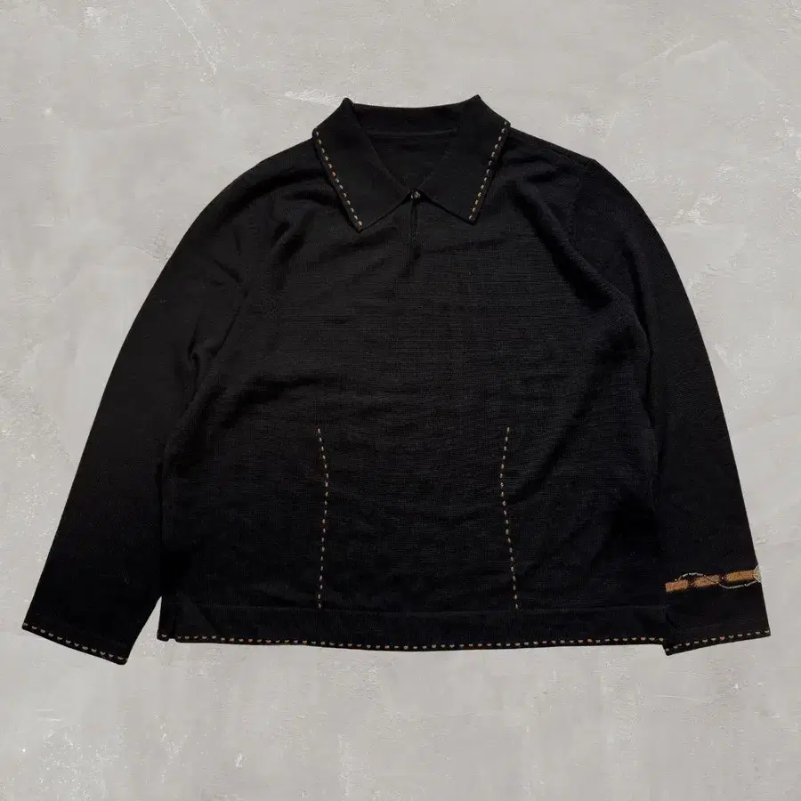 블랙 베이스에 배색 스티치가 돋보이는 디자인성이 높은 카라 부착 상의.