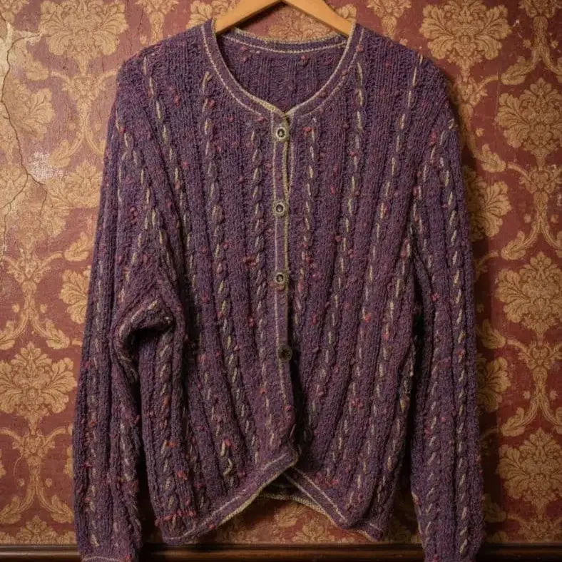 보라색 케이블 짜임 긴팔 가디건 고져스 버튼