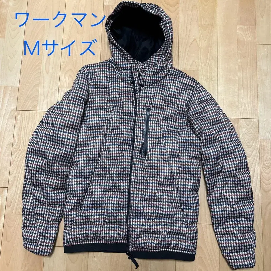 후드 부착 체크 무늬 점퍼, 지퍼 포켓과 조정 가능한 후드가 있습니다.