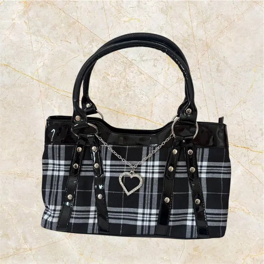 y2k 히메 스타일 갸루 페어리 그런지 체크 하트 백 블랙