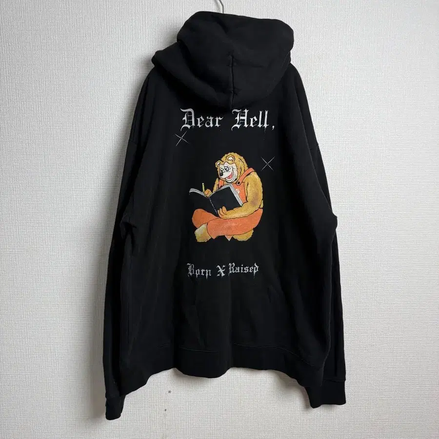 BORN X RAISED의 풀오버 후디. 프론트는 로고, 뒷면은 [Dear Hell,]이라는 문구와 독서하는 베어의 백 프린트가 포인트인 아이템입니다. 블랙 바디로 코디하기 쉽고, 하나만으로도 분위기가 나는 스트릿 스테디셀러. 일본 사이즈 상당: 남성용 XL 상당 (오버 사이즈/실측치수 참조).