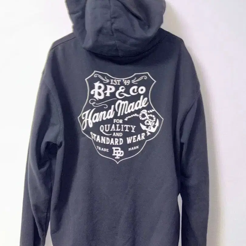자동 번역되었어요. 원문보기BP&Co. 로고가 특징인 네이비 색상의 집업 후드티.