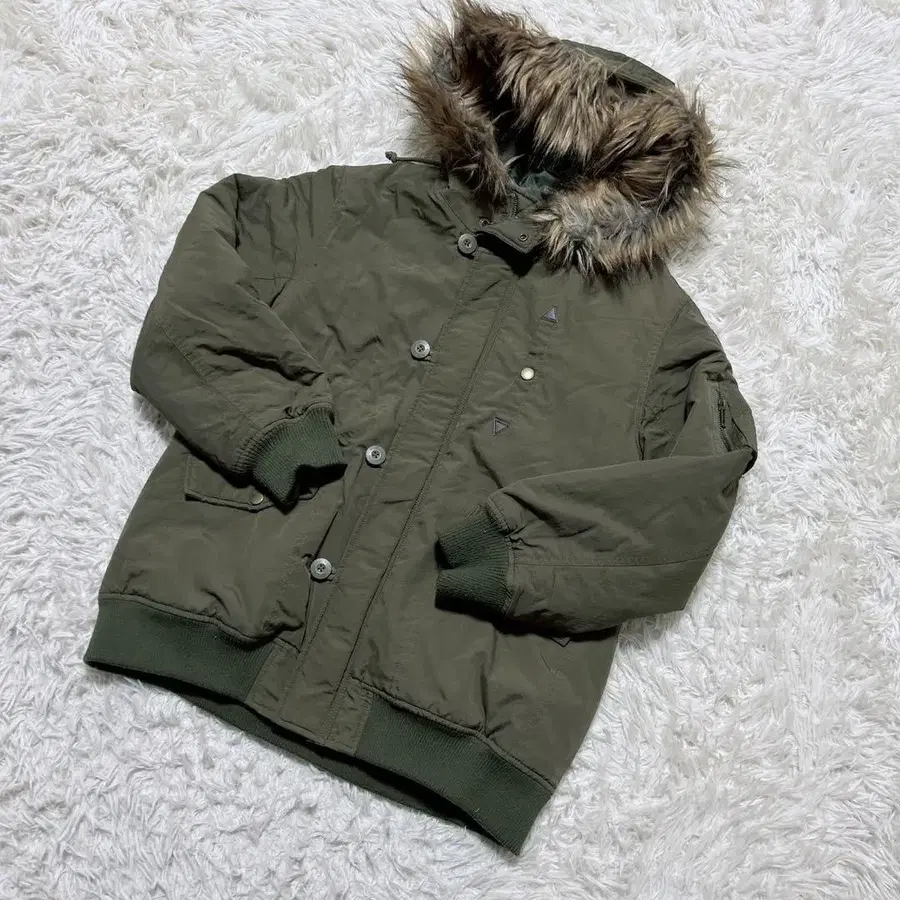 카키색 퍼가 달린 모즈 코트, 단추식 디자인으로 스타일리시합니다.