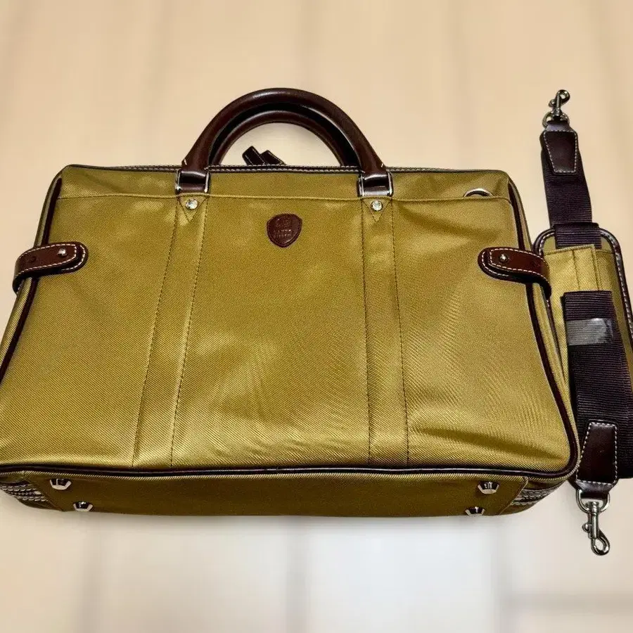 구매 후 한 번도 사용하지 않고 보관해 온 라이트 브라운 색상의 비즈니스 백입니다. 외부에는 포켓이 있으며, 내부에도 지퍼 포켓과 2개로 나뉜 포켓이 있습니다. 숄더로도 대응 가능합니다.
