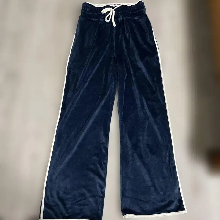 네이비 색상의 사이드 화이트 라인 디자인 팬츠, 폴리에스테르 95%로 쾌적한 착용감.