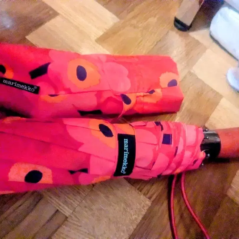 마리메꼬의 인기 상품인 접이식 우산입니다. 이 타입은 손잡이 부분의 버튼을 누르면 우산이 열립니다. 닫을 때는 일반 우산과 같이 손으로 닫습니다.