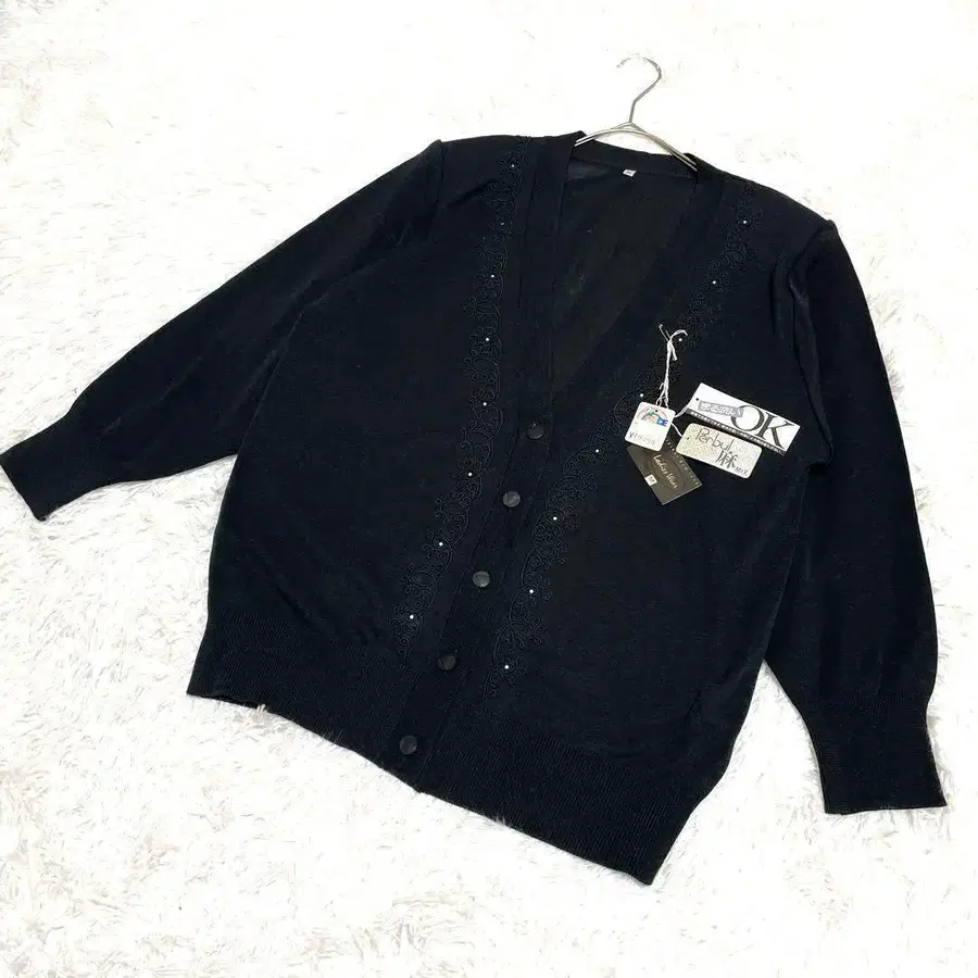 비즈와 자수가 장식된 블랙 V넥 가디건.