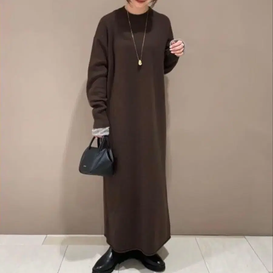자동 번역되었어요. 원문보기슬릿이 들어간 브라운 롱 니트 원피스로, 심플한 디자인이 매력적입니다.