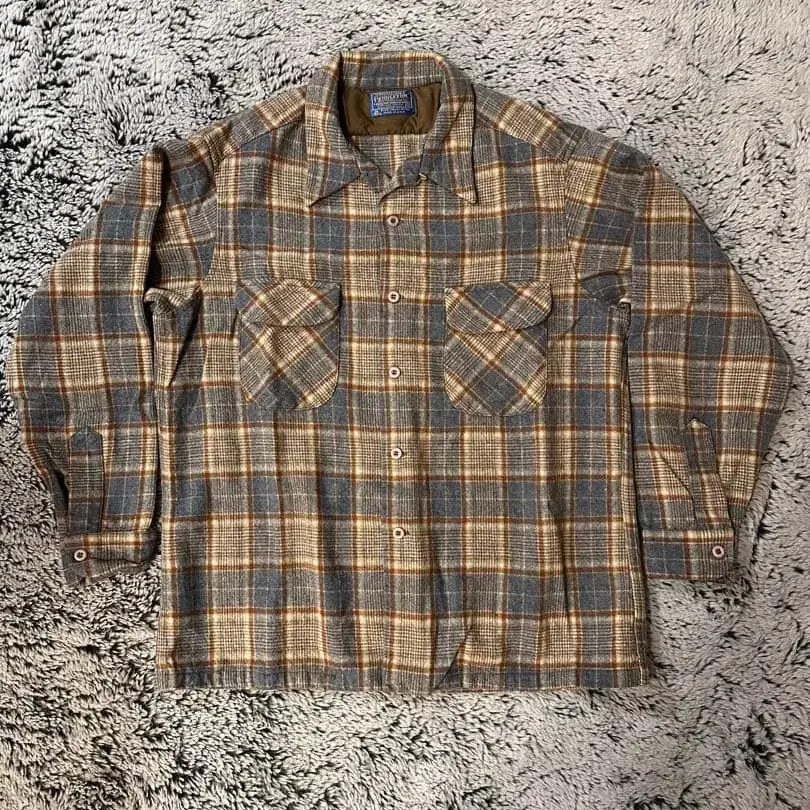 울 소재의 그레이, 브라운, 오렌지 체크 무늬 긴팔 셔츠, 프론트 포켓 부착.