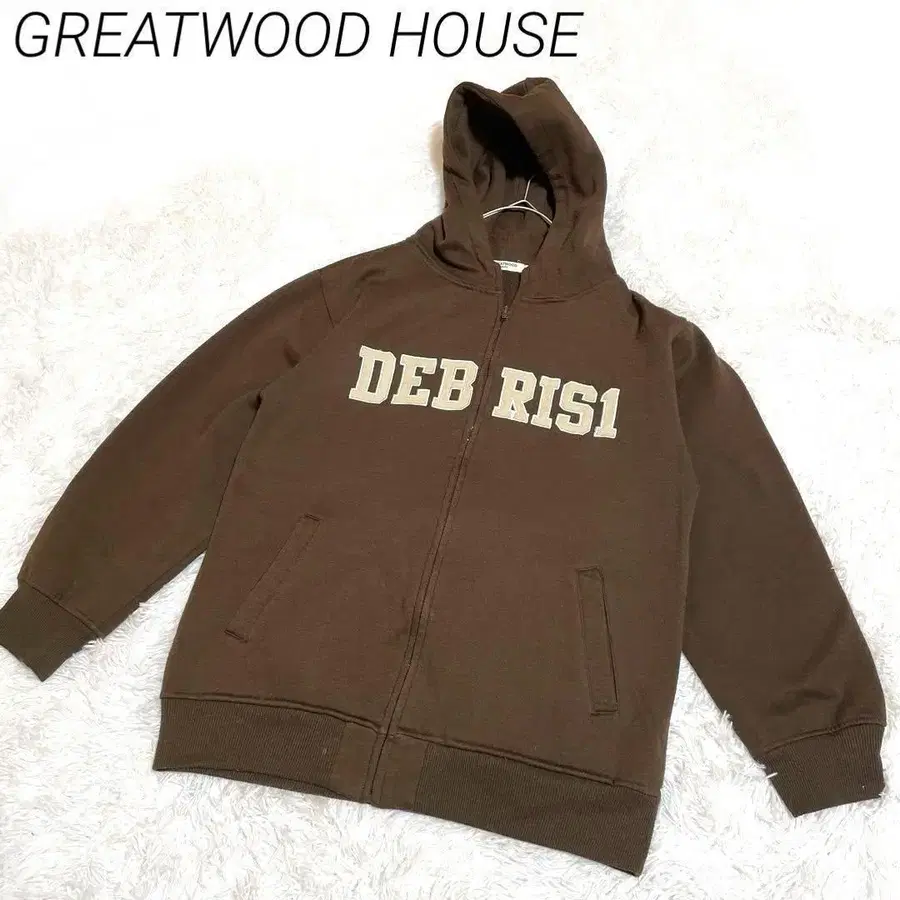 프론트에 [ DEB RIS1 ] 프린트가 들어간 브라운 색상의 집업 후드티.