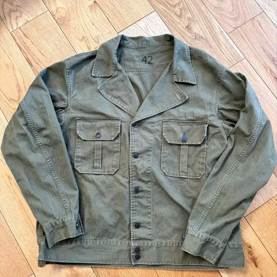 41~42년의 짧은 기간에 채용된 M-41은 다른 연대에 비해 밑단의 벨트와 뒷면의 요크 사용이 숏 기장의 트래커 자켓에 가까운 디자인으로 되어 있습니다. 소매의 커프스와 양 가슴의 플랩 달린 포켓 등 워크 의류에 통하는 디자인은 최근 매우 인기 있는 디자인으로, 레어한 개체와 골든 사이즈입니다.