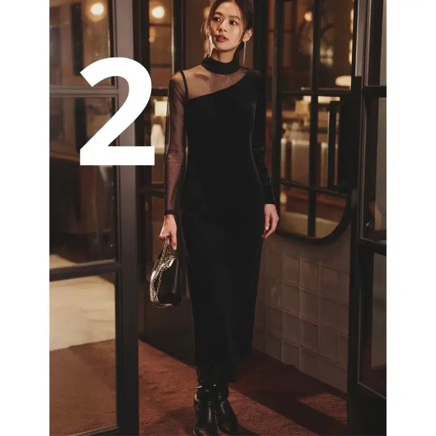 데콜테와 소매에 비침이 있는 스트레치 튤을 조합한 디자인이 센슈얼하고 모드한 인상을 더합니다.