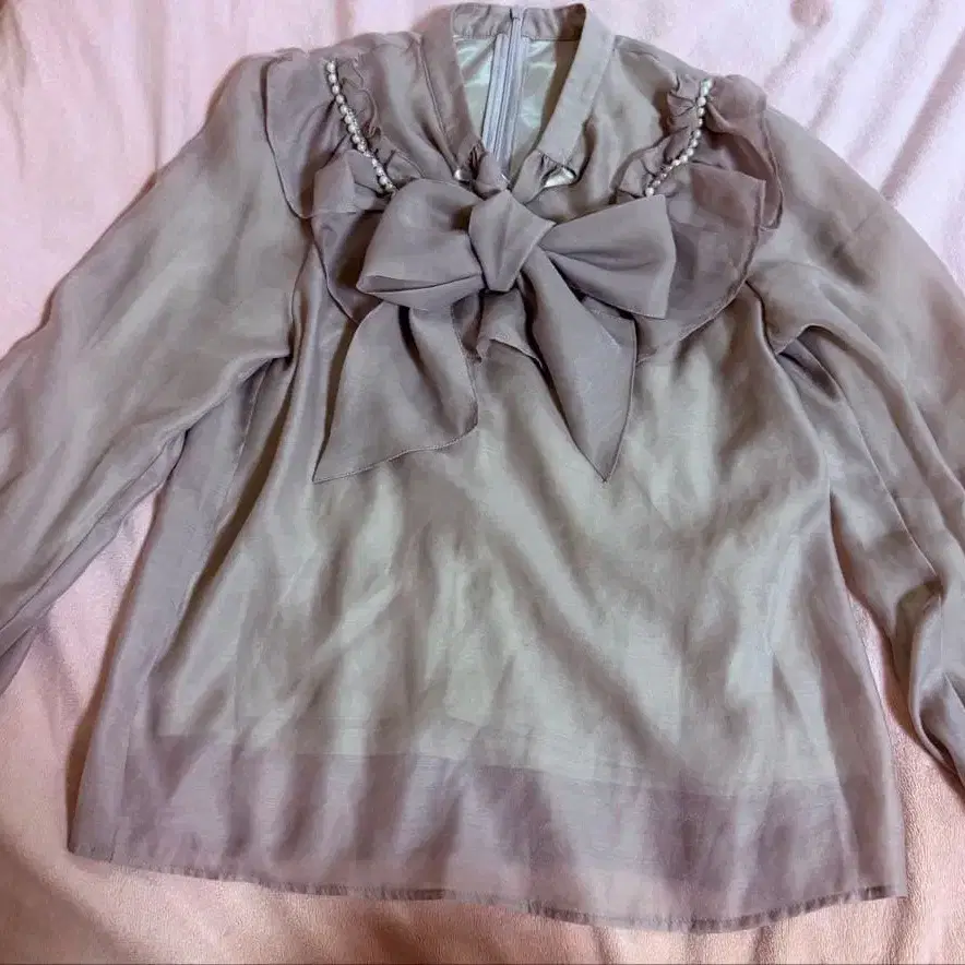 양산형 리본 포함 베이지 쉬폰 블라우스