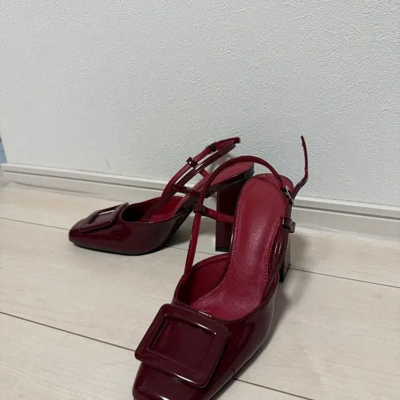 에나멜 소재의 버건디 슬링백 펌프스, 와이드 힐과 큰 버클이 특징. - 색상: 버건디 - 굽 높이: 와이드 힐 - 디자인: 슬링백 - 장식: 큰 버클 - 소재: 에나멜 방문해 주셔서 감사합니다. 색상 - 레드 계열 얼룩, 찢김, 냄새 등 - 없음
