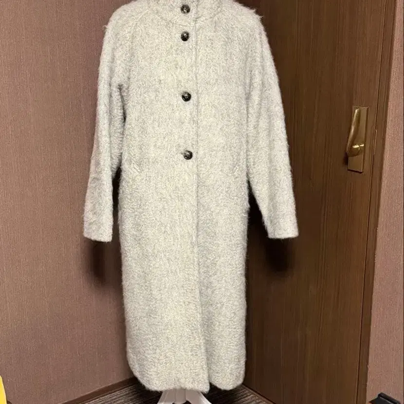 털이 긴 샤기 소재가 눈길을 끄는 스탠드 칼라 롱 코트입니다.