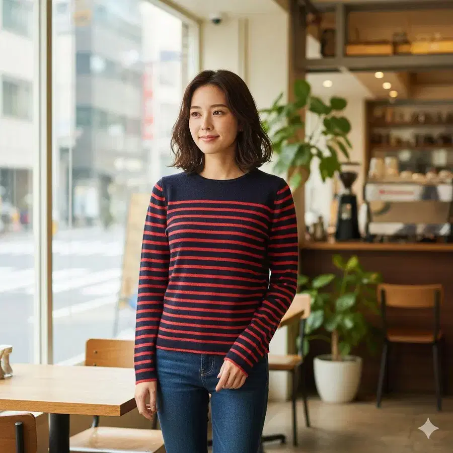 새상품급 맥피 투모로우랜드 울 100% 보더 니트 네이비 빨간색