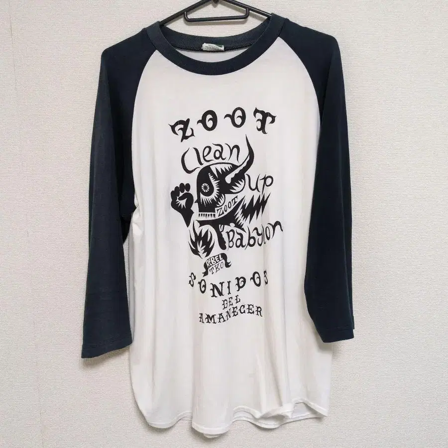 텍스트: 프린트에는 [ZOOT], [Clean Up Babylon], [REBEL TKO], [SONIDOS DEL AMANECER] 등의 글자가 확인됩니다.