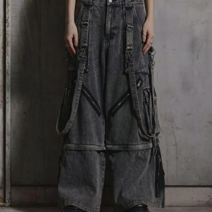 erar 3way 루즈 실루엣 하이 기믹 서스펜더 카고 데님 팬츠 블랙