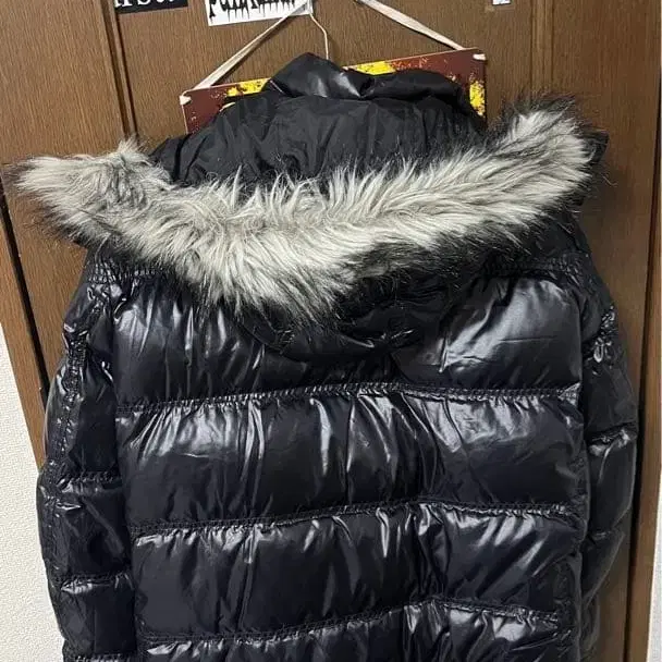 광택이 있는 블랙 원단에, 탈부착 가능한 퍼가 달린 후드가 부착된, 스타일리시한 디자인.