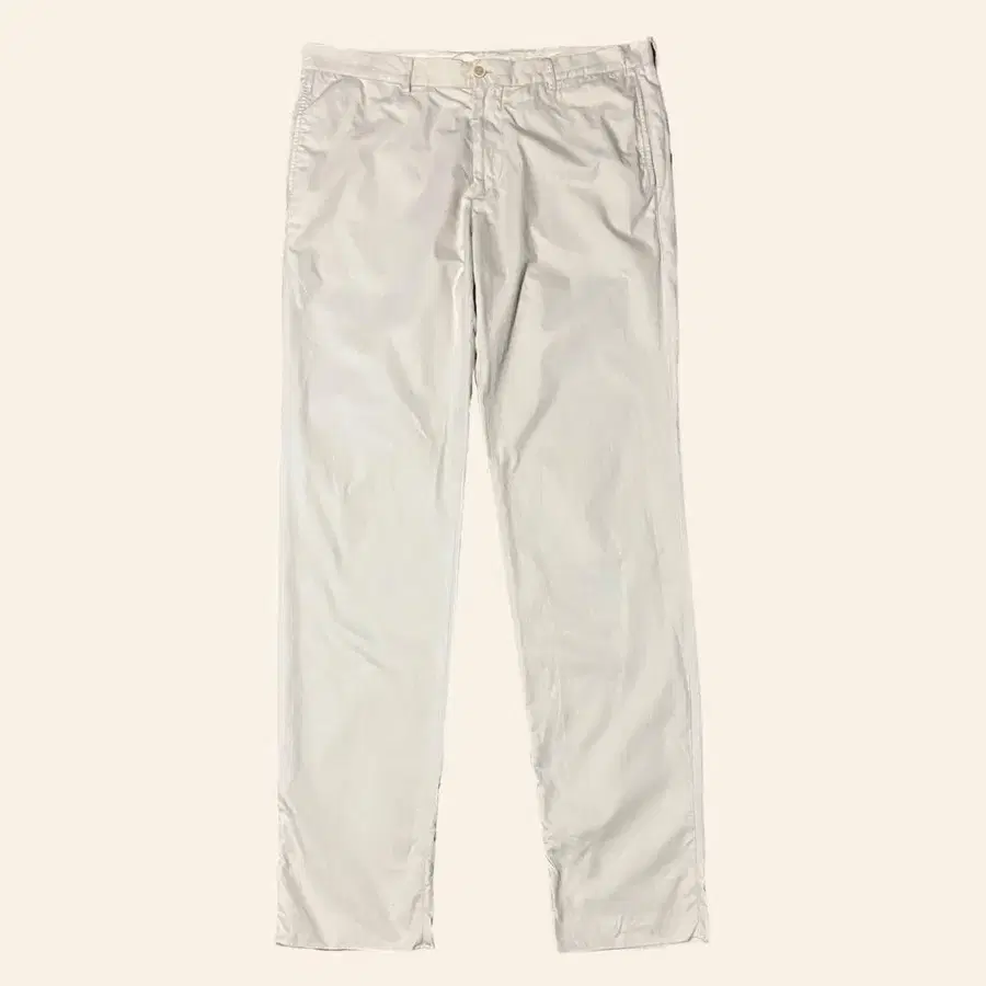 상당히 가는 번수의 실을 고밀도로 짜 올린 원단으로, 일반적인 코튼 팬츠와는 질감이 명확하게 다릅니다.