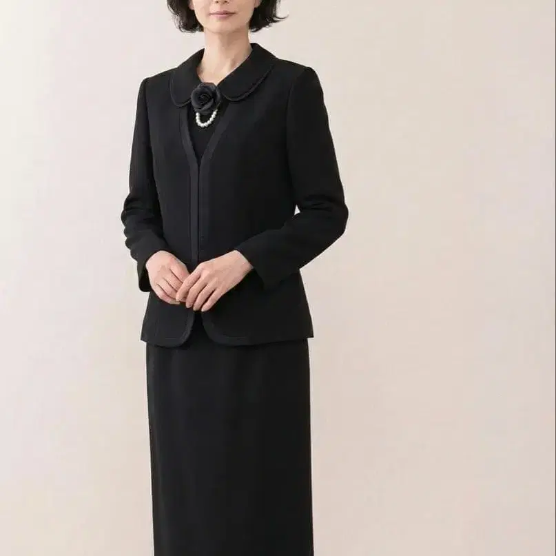 옷깃에는 장미 모티브와 진주풍 액세서리가 장식되어 있어 격식 있는 자리에 어울리는 화려함을 연출합니다.
