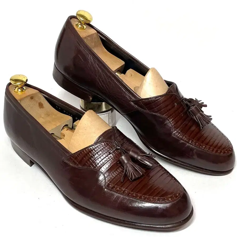가죽 참이 악센트가 된 브라운 태슬 로퍼입니다.