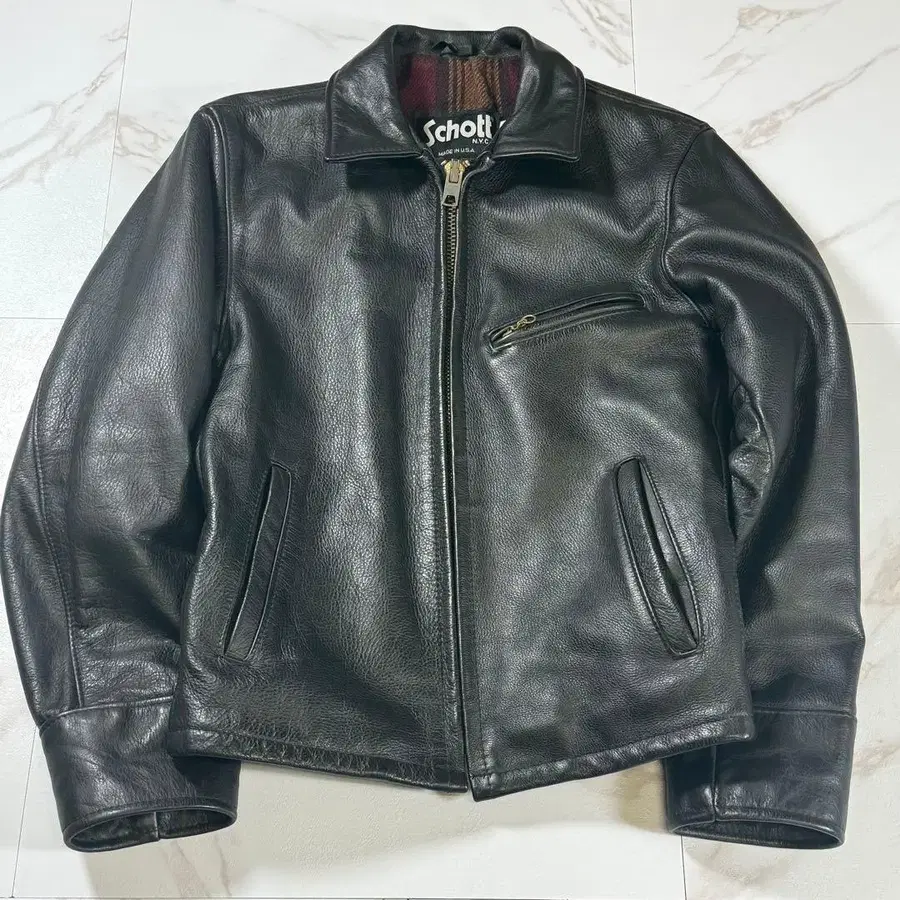 자동 번역되었어요. 원문보기[ 컨디션 최상/36 사이즈 ] SCHOTT 샷 가죽 트래커 자켓 집업 블루종 체크 안감 올 패턴 천연 가죽 블랙