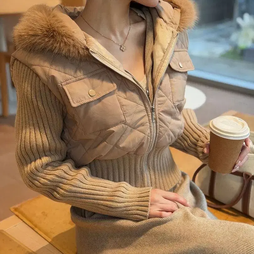 qung QUNG 퀼팅 플랩 도킹 다운 충전솜 베이지