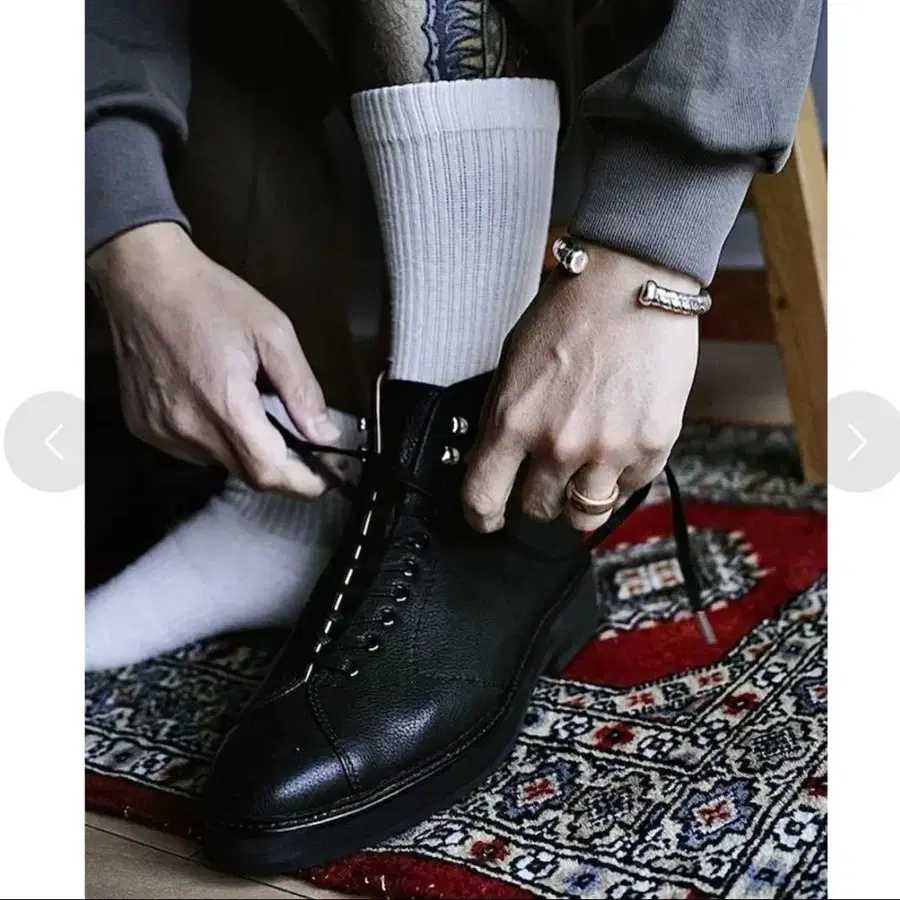 투 레이스업 레더 부츠 - 색상: 블랙 - 사이즈: 27 - 소재: 어퍼 소가죽, 라이닝 인조 가죽 - 러버 솔 두께: 힐 4cm, 프론트 2cm ーーーーーーーーーーーーーーーーーーーーーーーー - 몽키 부츠를 레이스업 스니커즈로, 레이스업 스니커즈를 몽키 부츠로, 양쪽의 관점에서 영감을 얻은 프로덕트. - 몽키 부츠보다 젠더리스하게. 레이스업 스니커즈보다 터프하게. - 걷기 쉽고 관리가 쉬운 주름 가죽을 어퍼에 사용하고, 라이닝에는 이염이 잘 되지 않는 인조 가죽을 사용. - 앞코는 너무 둥글지 않고 적절한 균형의 둥근 모양으로 어떤 팬츠와도 잘 어울립니다. - 밑창은 다이나이트 솔 패턴의 러버 사양으로, 착화감과 미끄러짐 방지, 마모 방지를 추구. - 주름 가죽은 컨트리 슈즈에 사용되기도 하여 튼튼하고 흠집이나 주름이 눈에 잘 띄지 않습니다. - 주름 가죽과 다이나이트 솔 패턴 러버의 조합으로 터프하고 편안한 한 켤레로. - 슈레이스에 칩, 입구에 후크를 달아 부츠의 느낌을 그대로 살렸습니다. 사이즈 - 27cm