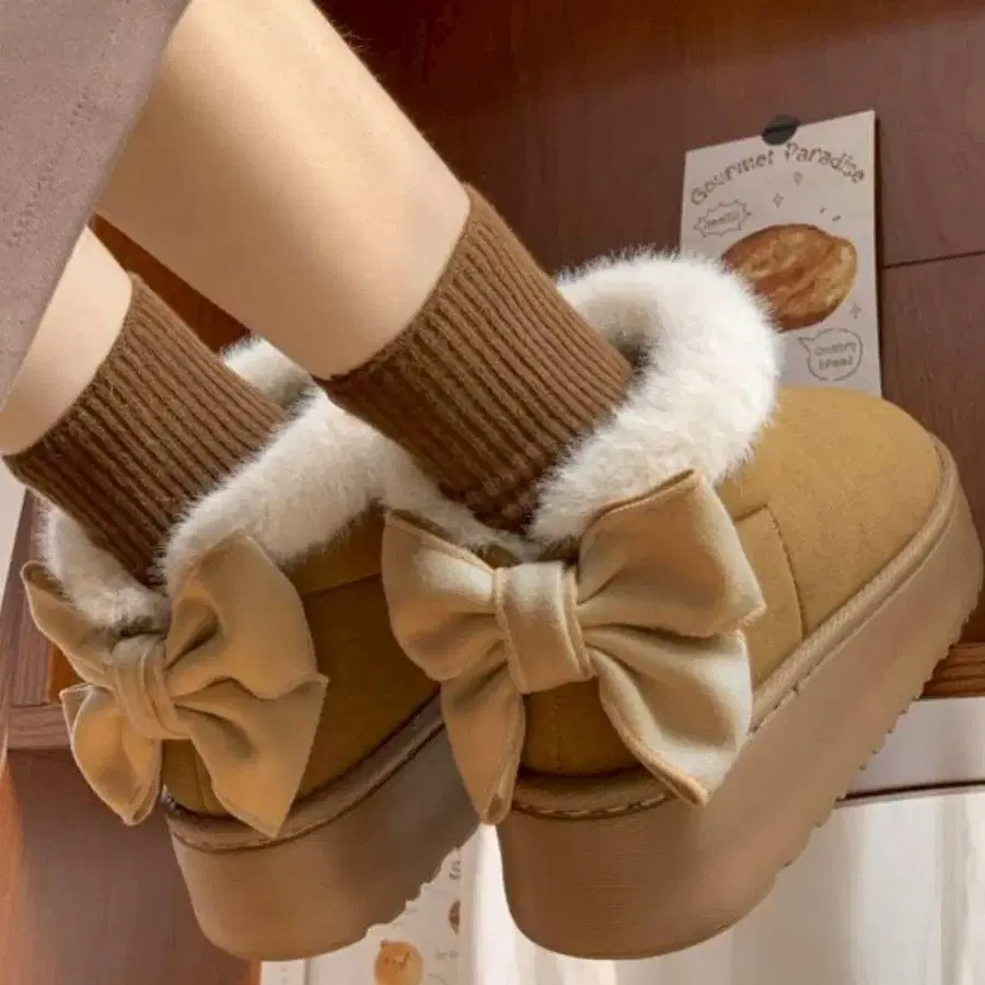 • 리본 퍼 통굽 숏 기장 어그 부츠 걸리시 24cm 카멜