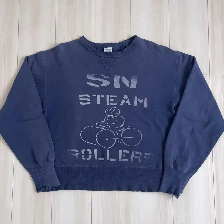 70s 빈티지 퍼플네이비 맨투맨 잉크 프린트 양쪽 V 좋은 페이드