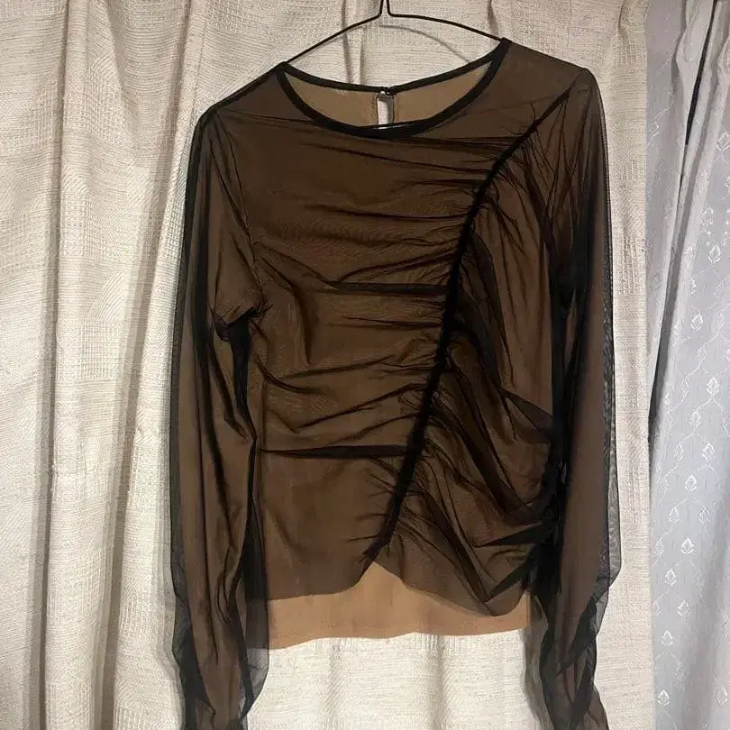 Ray BEAMS 브라운 시스루 긴팔 셔츠 개더