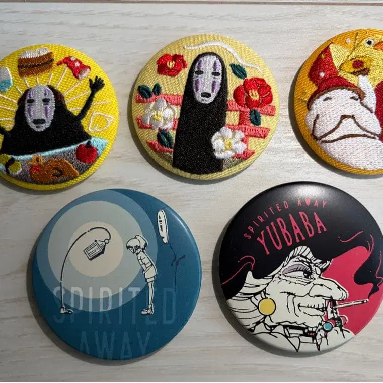 스튜디오 지브리 자수 및 프린트 캔뱃지 5개 세트. 위의 세 개는 자수, 아래의 두 개는 프린트입니다. 자택 보관이지만 눈에 띄는 흠집이나 왜곡 등은 없습니다. #지브리 #지브리뱃지 #캔뱃지 #센과치히로 #센과치히로의행방불명 #가오나시