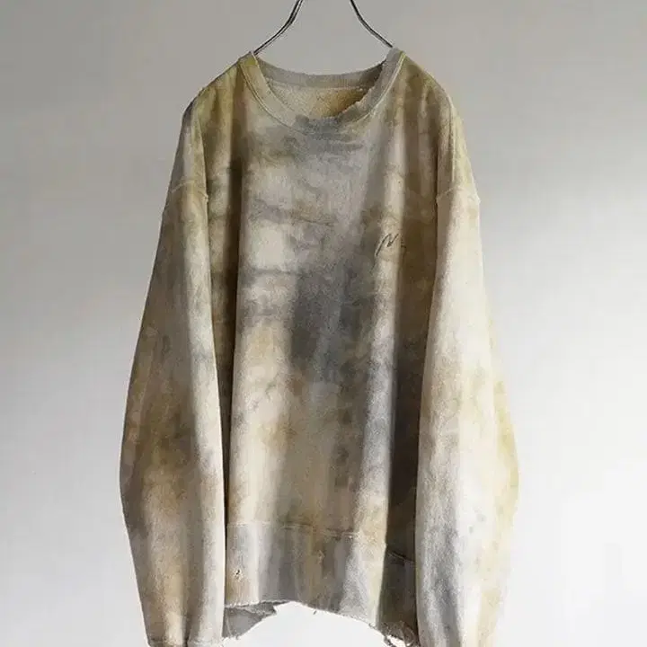 새로운 염색 방법으로 제작된 맨투맨. 사이즈 3 ※ 디자인으로서 브랜드 특유의 데미지 가공, 자연스러운 루즈한 사이즈감, 실루엣도 특징입니다. 이곳에서 구매했으나 이미지와 달랐기에 실내에서 한 번 시착만 했습니다. 소재는 1950~60년대에 생산되던 쭈리를 오리지널로 재현했습니다. 츠리편직기로 천천히 편직함으로써 랜덤한 돌기가 드러나 독특한 서리 내린 듯한 느낌과 루프를 표현했습니다. 방적사를 사용했기에 처음에는 뻣뻣하지만, 입을수록 질감이 살아나는 쭈리가 됩니다. 와카야마에서도 이 쭈리를 표현할 수 있는 츠리편직기는 극히 소수이며, 한번 다른 원단을 편직하면 재현이 어렵다고 합니다. 그 최고의 소재를 사용하여, 패턴으로 착용감을 높인 것에 일류 가공을 더해 존재감 있는 마무리가 되었습니다. 2가지 색상이 섞인 듯한 독자적인 염색 방법으로 제작했습니다. 추상 미술에서 영감을 얻어 진행했습니다. 유일무이한 한 벌입니다. MADE IN JAPAN