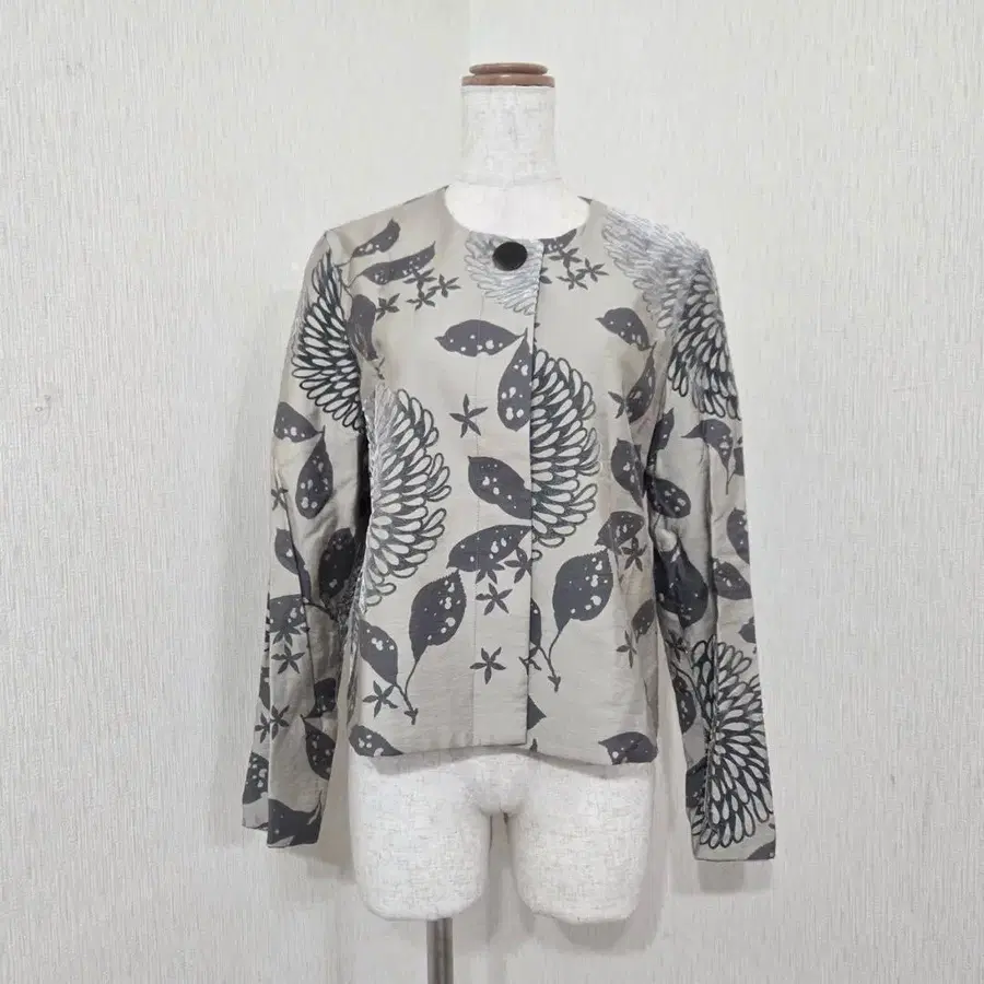 고급 원단에 대담한 플로키 꽃무늬가 장식된 개성 있는 아이템입니다. 심플한 버튼과 노카라 디자인이 세련된 느낌을 연출합니다. 일본제이며 꼼꼼하게 제작되었습니다. 안감이 있어 가을/겨울에도 적합합니다. 스타일리시함을 더해주는 포인트가 되는 자켓입니다.