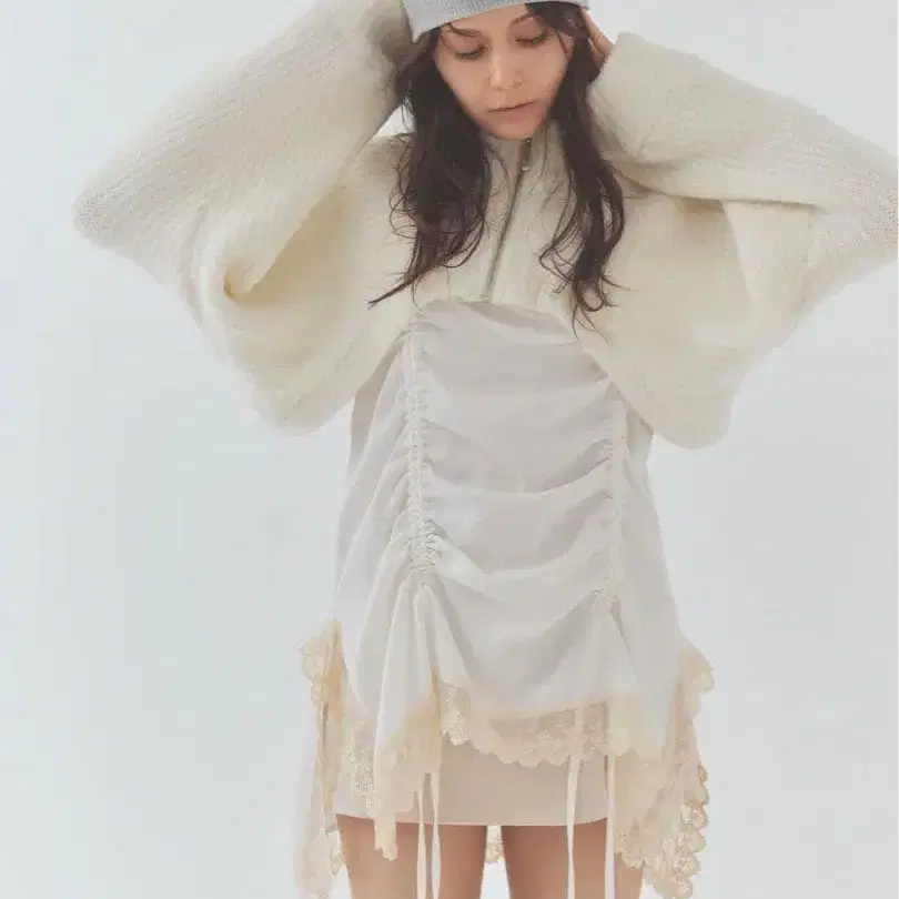 코디네이트에 포인트를 더한다는 의미를 가지며, [시럽을 뿌리는 것처럼] 이라는 이미지에서 탄생한 아이템입니다. 레이어드를 즐기실 수 있는 컴팩트한 기장감에 비해, 축 늘어지는 루즈하고 넉넉한 소매로 완성했습니다.