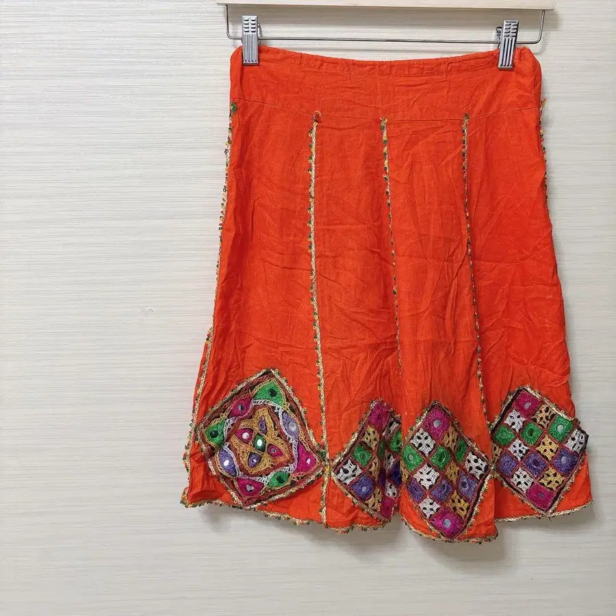하나뿐인 미러워크 자수 플레어 스커트 오렌지 에스닉 인도 끈 조절