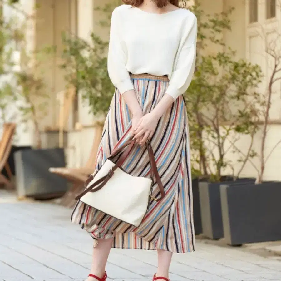 택 포함 새상품 핸드 스트라이프 프린트 세미 플레어 스커트