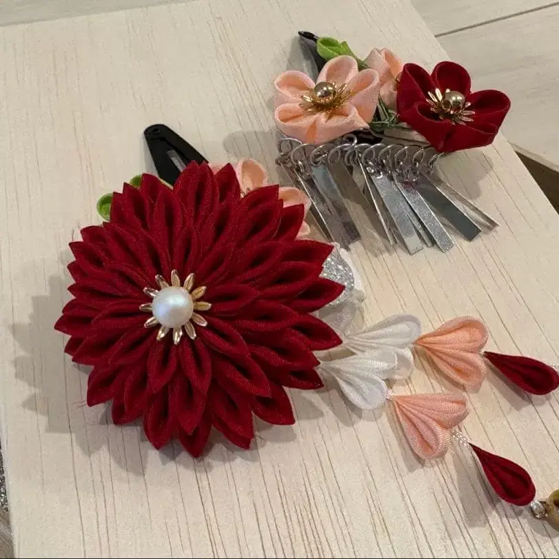 시치고산 새상품급 꽃 모티브 머리 장식 헤어콤 빨간색