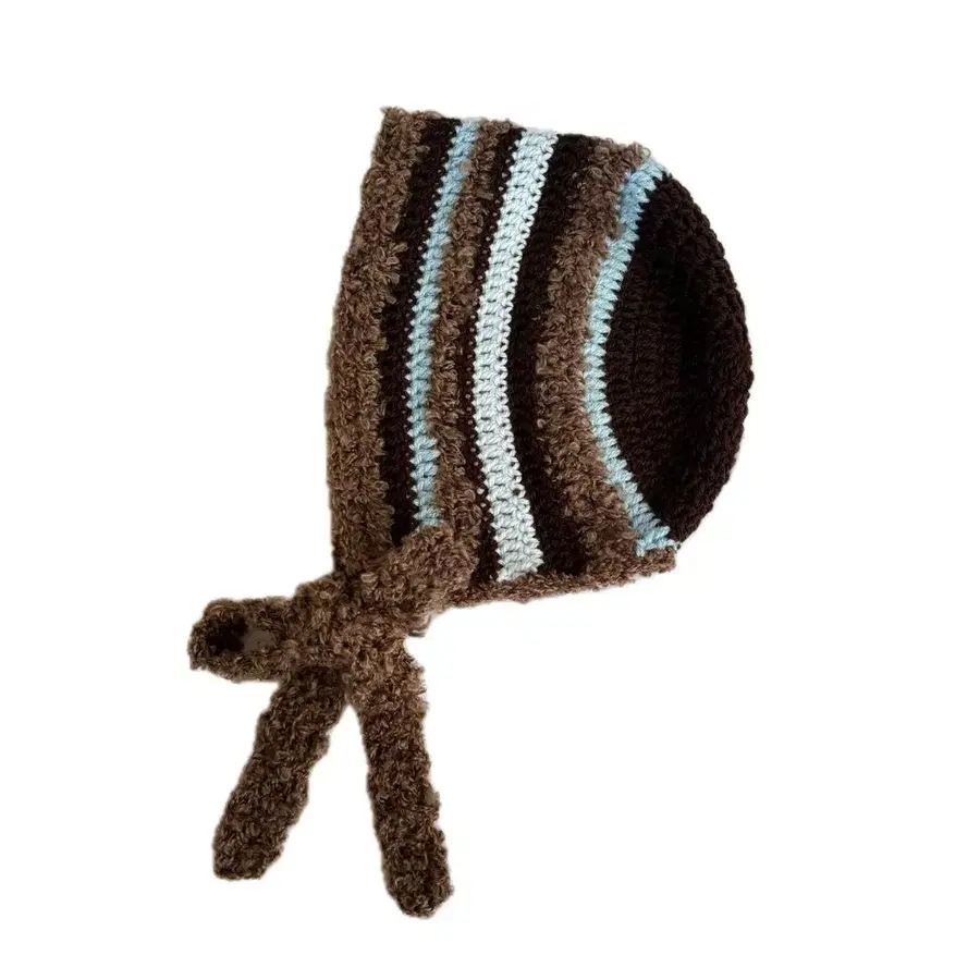 보닛 발라클라바 손뜨개질 니트 핸드메이드 브라운 x 스카이블루