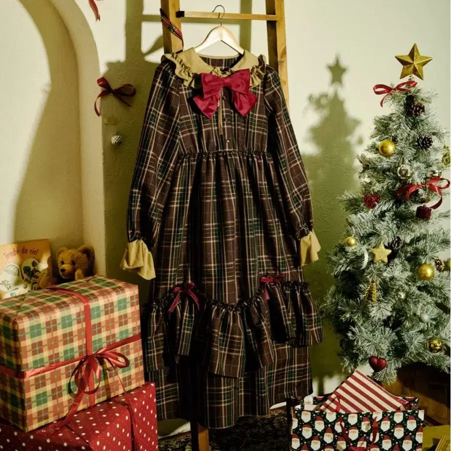 [ 틸과 레트로 ] 벨로아 리본 체크 티어드 리본 원피스 브라운