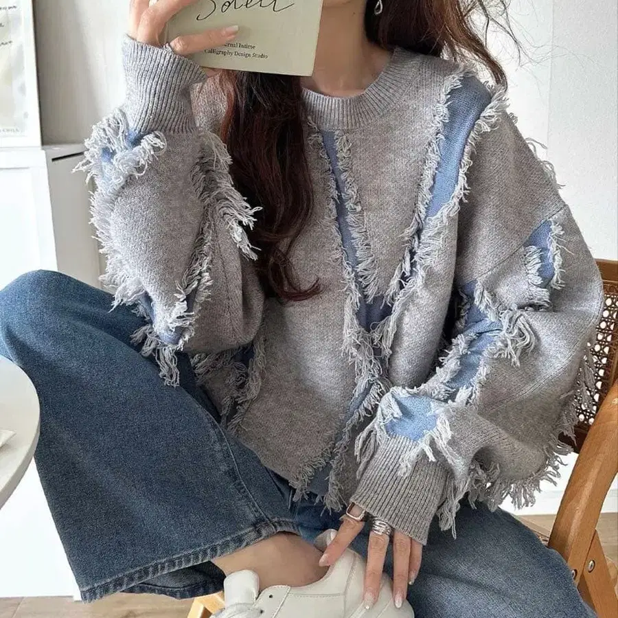 classicalelf 프린지 배색 오버 니트 (긴팔) 그레이