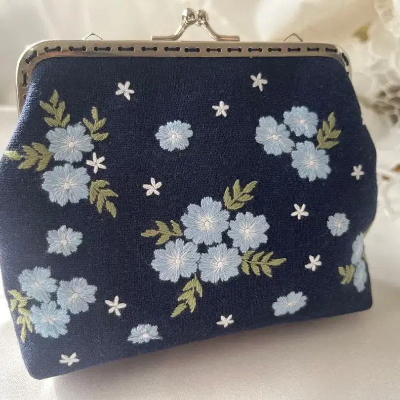 네모필라를 이미지화한 꽃 자수가 아름다운 가마구치 파우치입니다.