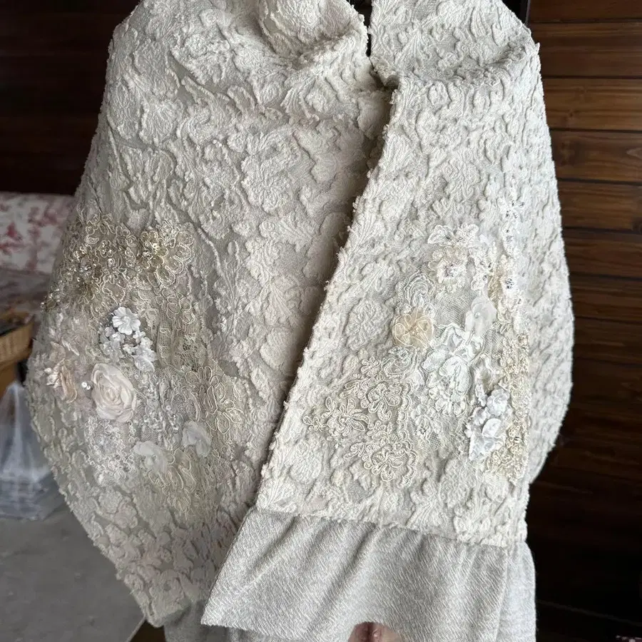 훼스테나렌테JAM의 복슬복슬한 원단 입체 레이스 파츠 부착 와이드 스톨.