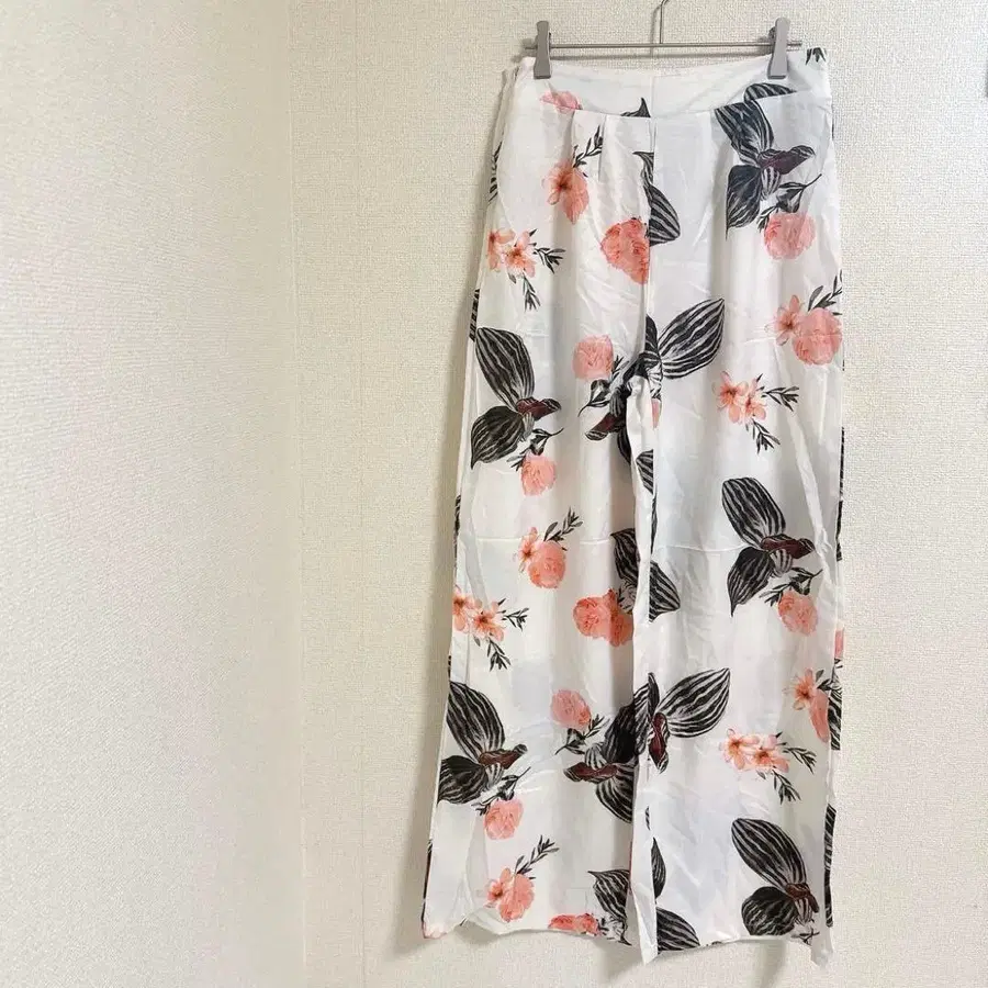 자동 번역되었어요. 원문보기플라워 프린트의 폴리에스테르 소재 와이드 팬츠, 가벼운 착용감으로 여름에 최적.