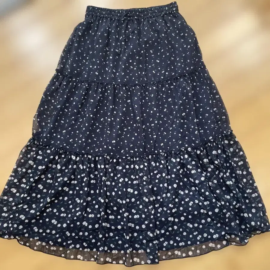 [새상품] 페루 티어드 스커트 네이비 계열 체리 패턴 플레어 스커트