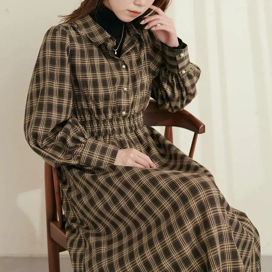 심플한 셔츠 원피스에 펄 버튼과 허리 셔링으로 포인트를 더했습니다.