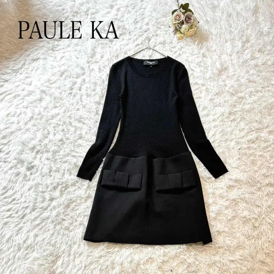 PAULE KA 폴카 니트 원피스 긴팔 리본 포함 블랙 36