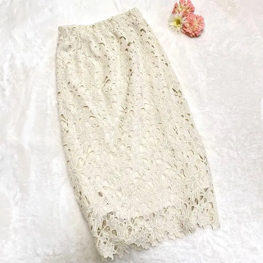 화이트 꽃무늬 무릎 기장 레이스 타이트 스커트