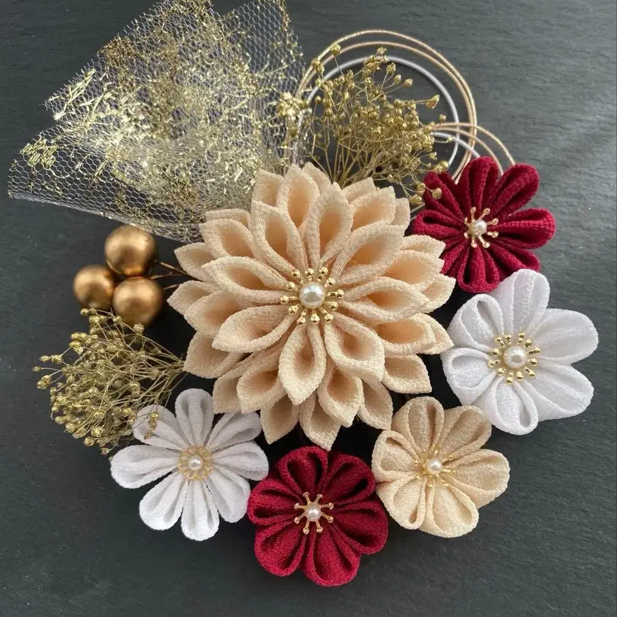 즉시 구매 가능 하나하나 정성껏 수작업으로 만든, 쓰마미자이쿠 머리 장식입니다. U핀 마감으로 되어 있어 어레인지하기 쉽고, 헤어스타일에 맞춰 자유롭게 배치하실 수 있습니다. ■ 세트 내용 메인 꽃 ( 약 7cm ) x 1 작은 꽃 ( 약 3.5~4.5cm ) x 5 튤 리본 안개꽃(골드) x 2 미즈히키(화이트, 베이지, 골드) 구슬 장식 ■ 색상 꽃: 화이트, 베이지, 진홍색 꽃술: 골드 컬러 펄 ■ 사용 장면 성인식, 졸업식, 시치고산, 결혼식 등 일본 의류나 특별한 날의 의상에 추천합니다. ■ 주의사항 구슬 장식에는 구매 시부터 작은 흠집이 있습니다. 미리 양해 부탁드립니다. 하나하나 수작업으로 제작하기 때문에, 사이즈나 모양에 약간의 개체 차이가 있습니다. 강하게 잡아당기거나 침수에는 주의해 주세요. 완벽한 제품을 원하시는 분은 구매를 삼가해 주시기 바랍니다. 모니터 환경에 따라 실제 색상과 다를 수 있습니다.